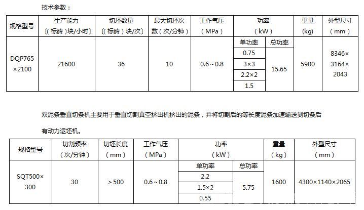 带倒角切坯机用于将切条机后有动力运坯机输送来的泥条切割成规定尺寸的砖坯。当输送来的为单泥条时,泥条经过倒角装置倒角后切割成砖坯;当输送来的为双泥条时,泥条不经过倒角直接切割成砖坯。
